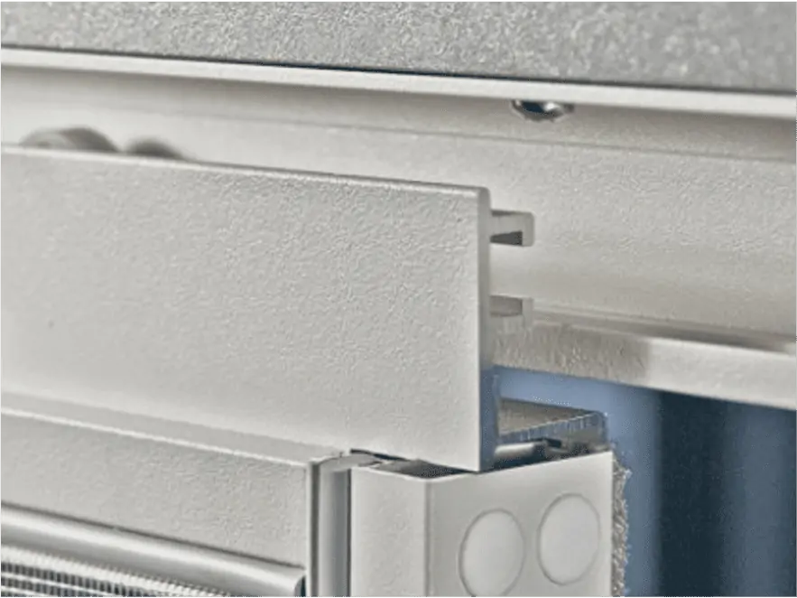 La moustiquaire coulissante est suspendue à un rail et elle coulisse grâce à des roulettes, celle ci sont invisibles.